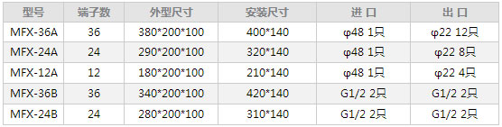 华彤电气集团官网 >> 仪表管件阀门 >> YZX3MFX接线箱 YZX3MFX接线箱 产品参数 概述:MFX系列防溅式接线箱,箱体采用铝合金精制而成,可作为多芯电缆终端接线和电缆的分线接线等,适用于500V以下的低压电器回路中。分为A型与B型两种,A型进出口为密封填料盒,B型进出口为内螺纹接头。·产品结构和外形尺寸: 推荐产品 IBS智能母线系统 智能母线接头单元 智能母线槽 CMC-3A密集绝缘母线槽 FMC风力发电母线系统 FSMC防水母线槽 HF滑触母线 LMC-3A铝壳母线槽 绝缘管型母线 全绝缘屏闭管型母线 HT内防震齿槽 磁悬浮减震器 电气设备远程监测预警管.. 燕尾槽 智能控制箱 高强节能轻质不锈钢电缆.. 节能桥架 YBZ1-3 NGZ系列防尘挠性.. YZB1-2增安型防爆挠性连.. YZG18 KFQ系列空气分配器
